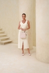 Descubra o charme do conjunto de saia + blusa confeccionado no exclusivo tecido Marant, que oferece textura e conforto incomparáveis. A saia apresenta um recorte frontal que valoriza a silhueta, enquanto a blusa estilo corset realça a cintura com delicadeza, acompanhada por um cinto que finaliza com requinte.
